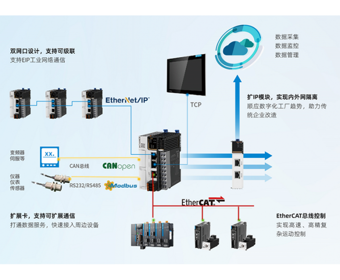 • EASY还可打通数据服务,支持Ethernet/IP(最小通信周期5ms)、MODBUS-TCP 、CANOPEN等多种工业通信协议,从容接入周边设备,高速数据传输。